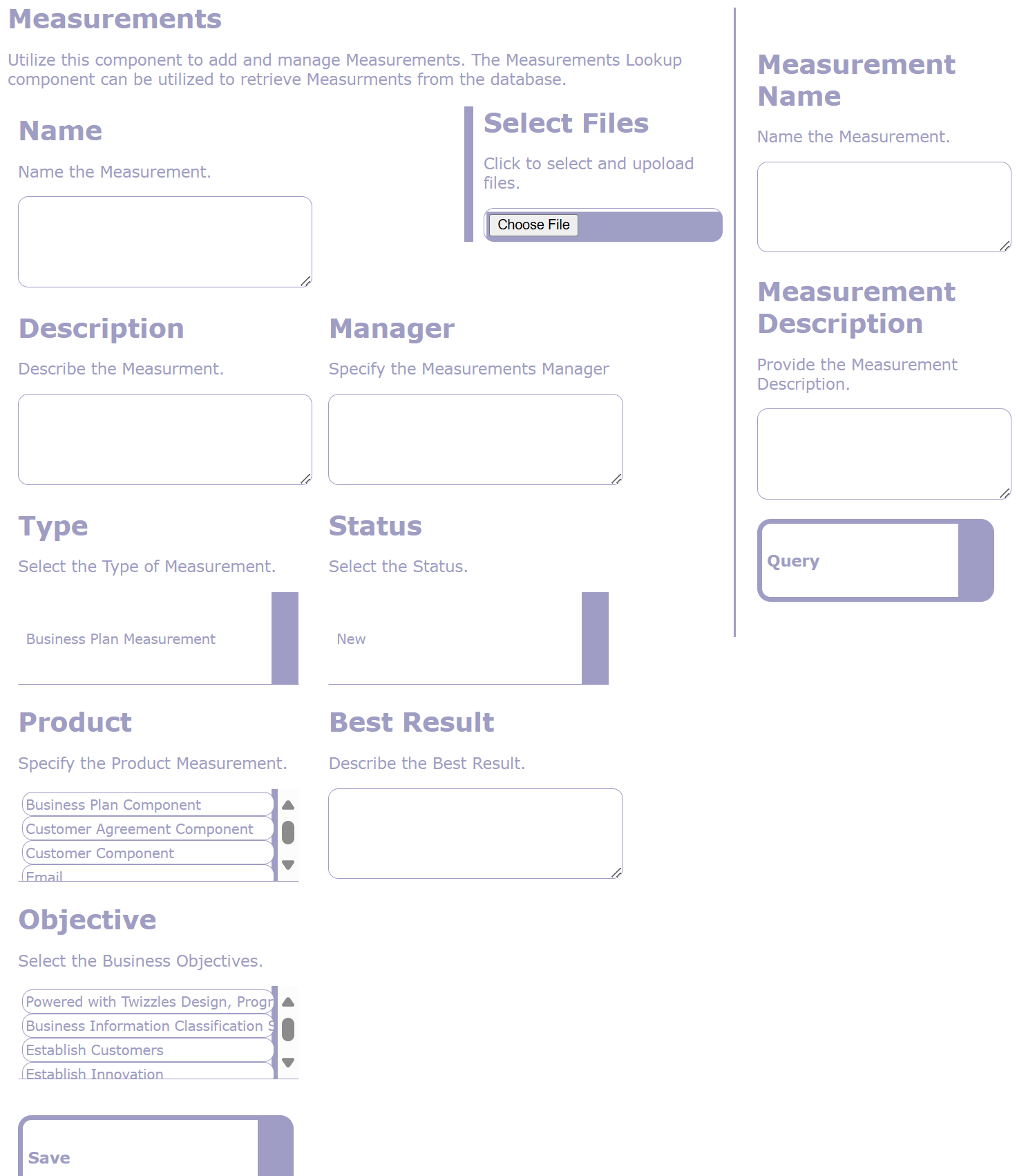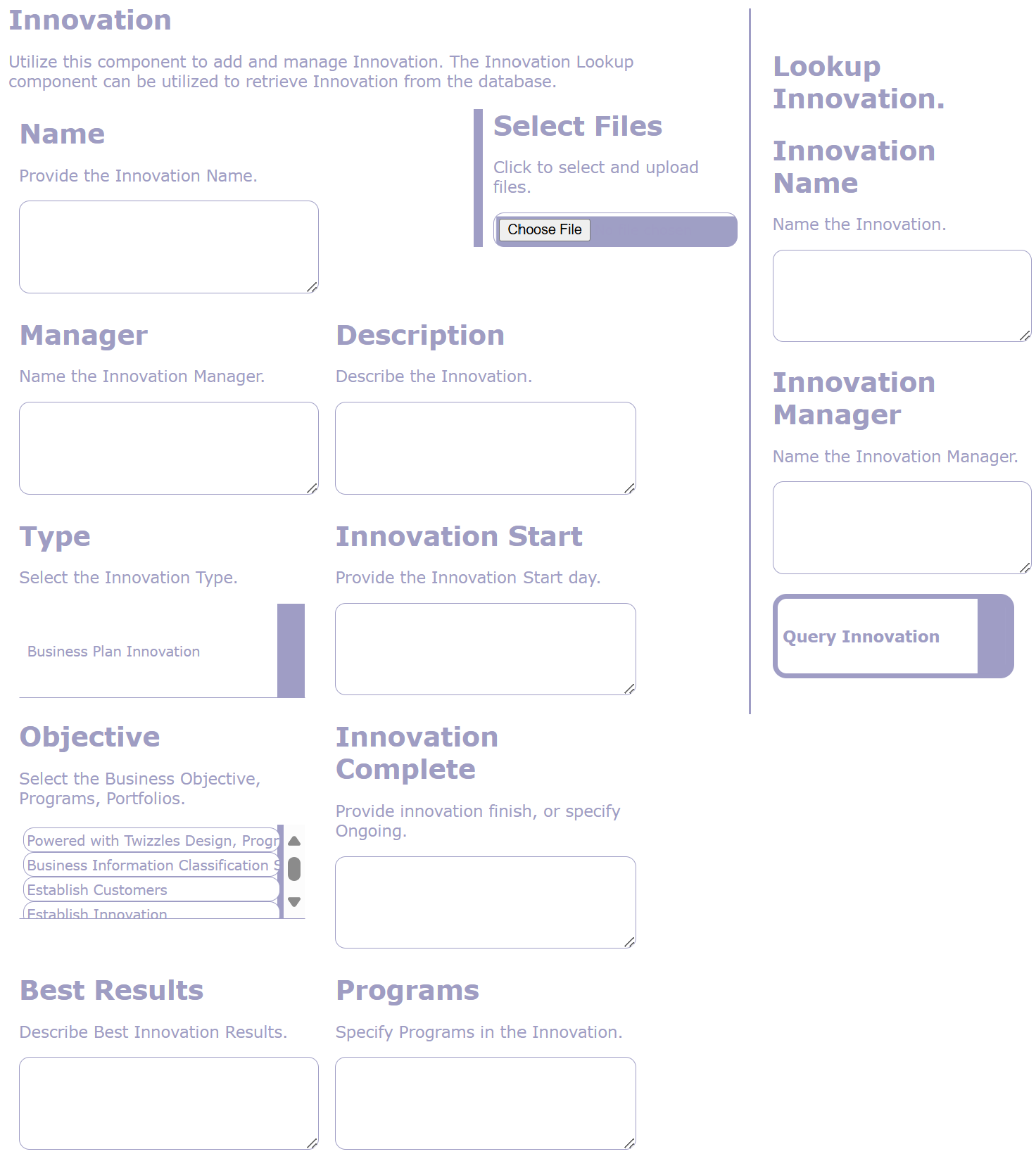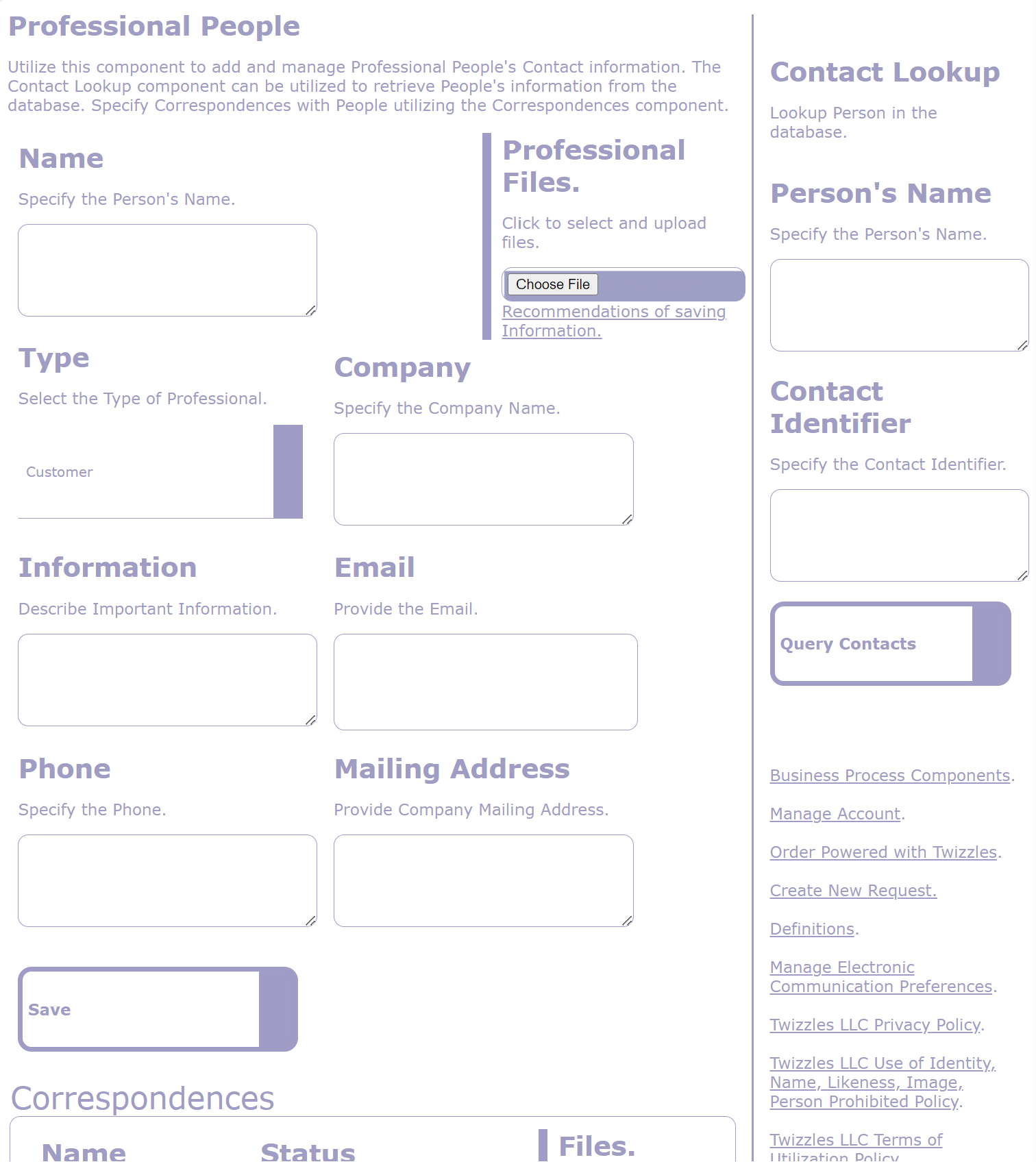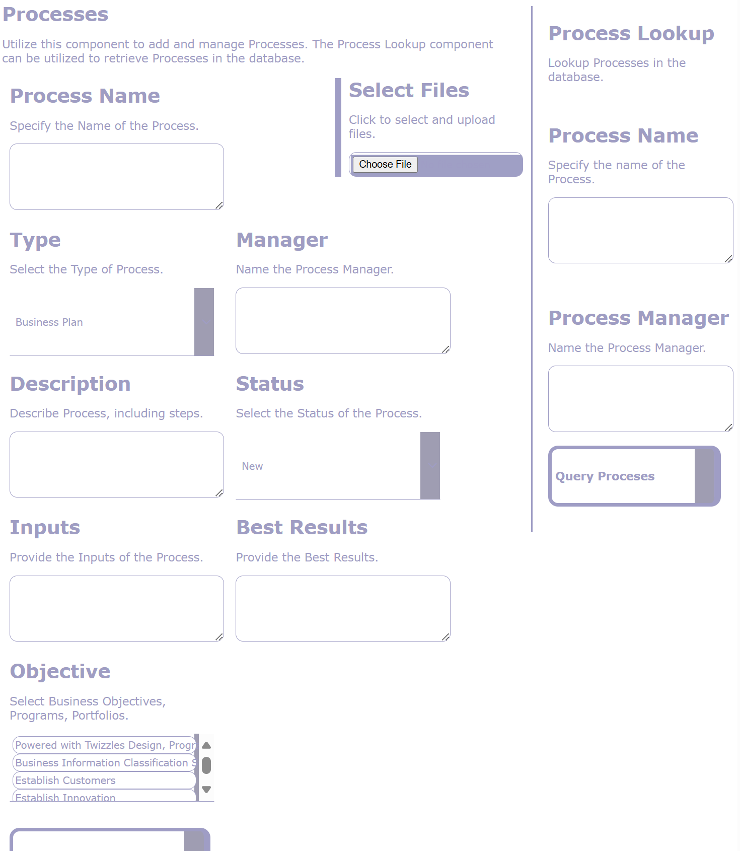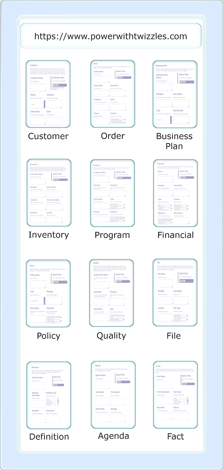 The Agenda component provides the addition, management, and retrieval of Meeting Agenda and can include the attendees, timeframe, meeting objectives. Agenda is intended to manage meeting inputs and produce best results. Click on the Agenda component and view the Agenda component. Business Objectives are the important Goals that the Company Executive and Leadership team establishes, that make up the Business Plan, and then the Departments and Employees can link their Tasks and efforts to those Business Objectives. Click on the Business Objective image and view the Business Objective component. Business Plan is the important Business Objectives and plans of Company, Departments and or Person. The Business Plan component provides option of Adding new Business Objectives with specific timeframe, and can be specific to Company Departments. Click on the Business Plan image and view the Business Plan component. The Contact component provides the addition, management, and retrieval of important People information, such as Customers, Prospective Customers, Service Providers, Goods Providers, and Friends of the Business, with option of tracking Communications with the Contact. Click on the Contact component and view the Contact component. Twizzles LLC Customers can initiate the request of Custom Components, including functionality, automations and integrations, and requires unique Customer Agreement contract with Twizzles LLC that defines the scope, schedules, responsibilities, team, fees. Click on the Custom component to order. The Customer component provides the addition, management, and retrieval of Customer information, such as Customer Profile, Correspondences, and Contracts. Click on the Customer component and view the Customer component. Definition is the important Business terms, abbreviations, and meanings that guide Employees and Customers in their work, and is intended to provide clarity and clarification of important Words utilized in Business. Click on the Definition image and view the Definition component. Employee includes the Employee Career Plan and important Employee work that aligns with the Business Objectives and plans of the Company. The Employee component provides option of Adding new Employee Business Objectives with specific timeframe, and can be viewed with Manager during Employee Management process. Click on the Employee image and view the Employee component. Fact provides repository of important Facts that may be utilized in managing Business, and include categories such as General, Customer, Employee, and includes function of adding the fact Source, and includes Process flow of reviewing and approving Facts, if required. Click on the Fact component and view the Fact component. Utilize the File component to upload, save, and manage Documents, while categorizing files with Managers and Types. The File Process Component provides file management option of Business Information. Click on the File image and view component. Financial is important Business Finance statement. The Financial Component can be utilized to add and manage Financials, upload and Save important Financials documents in various file types. Click on the Financials image and view the Financials component. Guideline is the important recommendation and rule that Employees and Customers are requested to be in compliance with. Add Guidelines to keep the final version, in addition to the specific Guideline information. Click on Guideline image and view the Component. Important Information component provides option to save important information, the location of that information, and the Source of the information, along with status. Innovation is the new and enhanced Products, methods, and processes that the Business is planning, implementing and managing. Click on the Innovation image and view the Innovation component. Inventory is the tangible, digital or electronic finished goods made, or sourced components made or purchased. Specify when Inventory is made and where the Inventory is located. This Component can be utilized to track electronic files and products. Click on the Inventory image and view the Inventory component. Measurement provides the key performance metrics that the Business, Department, or Person can utilize to manage quality Products. Click on the Measurement image and view the Measurement component. Order is request from Customer to provide Goods and or Services and the Component provides option to specify Goods, Prices, order status, customer information, and accepts credit card payments. Click on the Order image and view the Order component. Payment can be utilized to track Payments made from Customers, and can be integrated with Electronics and Online Payments provider, with Custom option. Click on the Payment image and view the Payment component. Picture provides the option of categorizing and storing Business specific images that can be stored and retrieved from the File Server and provide information of the picture, including when and where picture was taken. Click on the Picture image and view the Picture Component. Policy is the important Business Guideline and Rule that Employees and Customers are requested to be in compliance with. The Policy component provides option of adding and managing Business Policies. Click on the Policy image and view the Policy Component. Portfolio provides the grouping of Programs and Business Objectives into Departmental or Portfolio view, and includes Portfolio Manager, statuses, and timeframes. Click on the Portfolio image and view the Portfolio Component. Principle is important Business values and attributes that guide the Organization. Click on the Principle image and view the Principle component. Process includes the steps and activities that the Business requires, categorized with Statuses, Managers, Types, and like all Components, provides the option of saving Process files and documents onto the file server. Click on the Process image and view the 