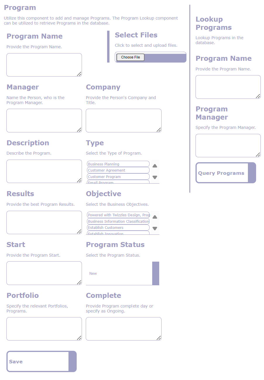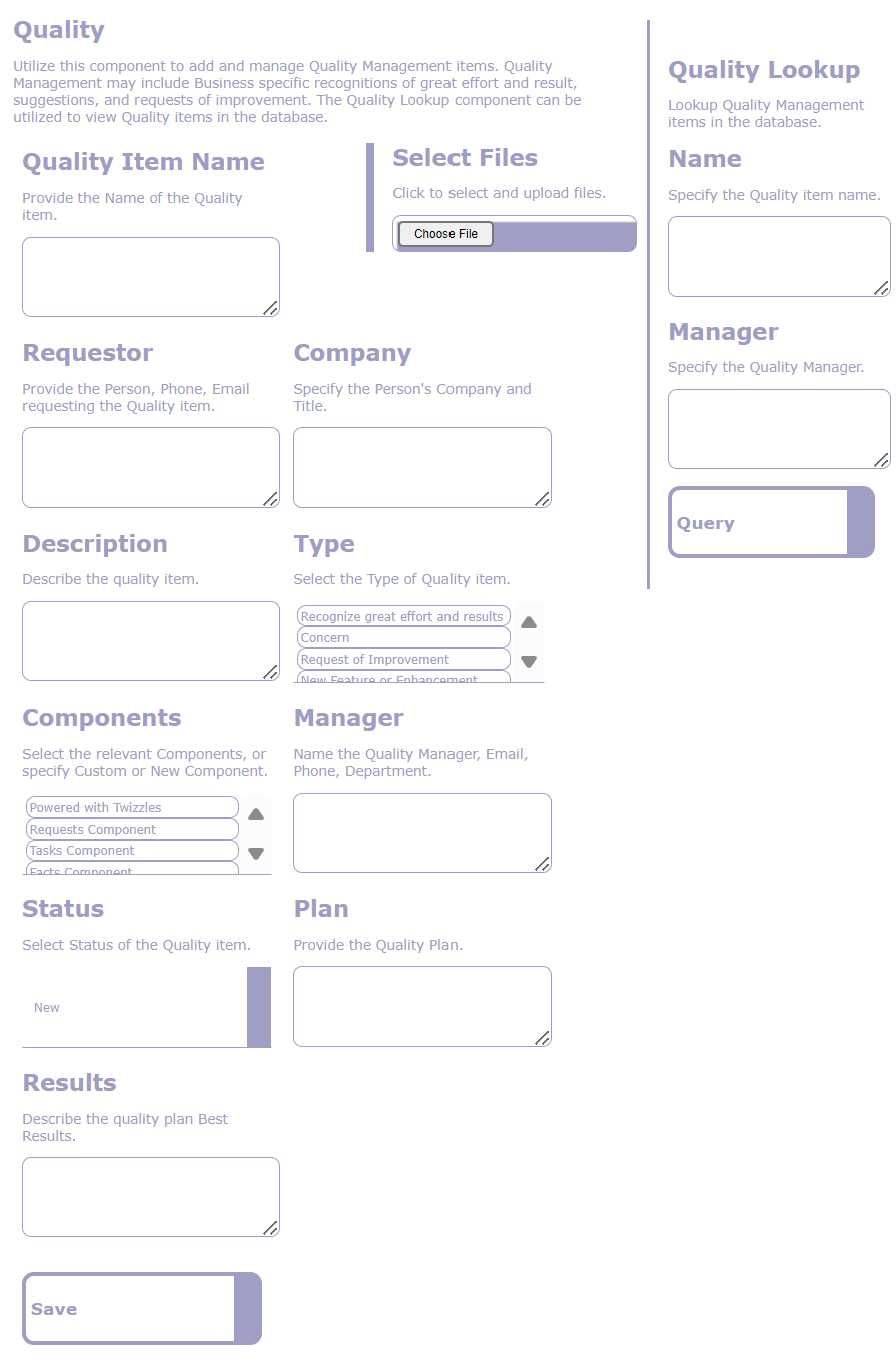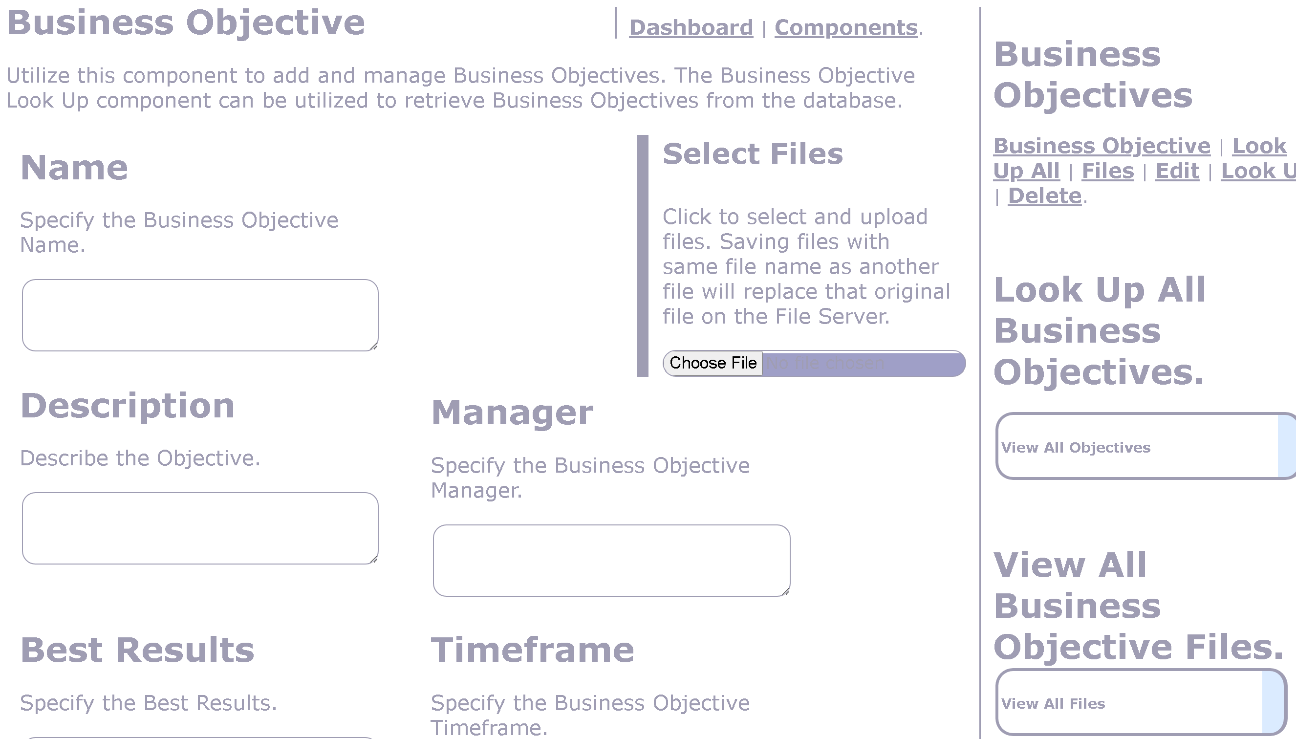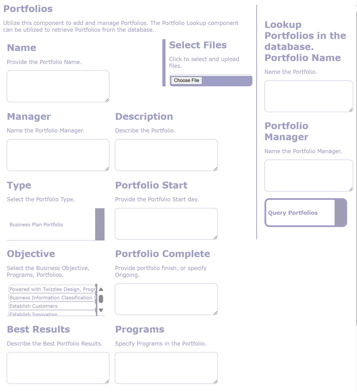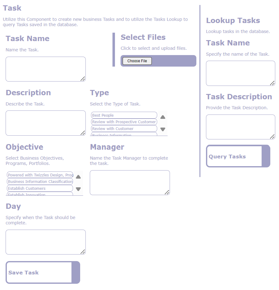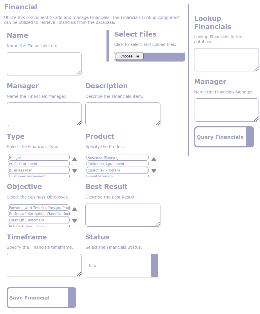 The Agenda component provides the addition, management, and retrieval of Meeting Agenda and can include the attendees, timeframe, meeting objectives. Agenda is intended to manage meeting inputs and produce best results. Click on the Agenda component and view the Agenda component. Business Objectives are the important Goals that the Company Executive and Leadership team establishes, that make up the Business Plan, and then the Departments and Employees can link their Tasks and efforts to those Business Objectives. Click on the Business Objective image and view the Business Objective component. Business Plan is the important Business Objectives and plans of Company, Departments and or Person. The Business Plan component provides option of Adding new Business Objectives with specific timeframe, and can be specific to Company Departments. Click on the Business Plan image and view the Business Plan component. The Contact component provides the addition, management, and retrieval of important People information, such as Customers, Prospective Customers, Service Providers, Goods Providers, and Friends of the Business, with option of tracking Communications with the Contact. Click on the Contact component and view the Contact component. Twizzles LLC Customers can initiate the request of Custom Components, including functionality, automations and integrations, and requires unique Customer Agreement contract with Twizzles LLC that defines the scope, schedules, responsibilities, team, fees. Click on the Custom component to order. The Customer component provides the addition, management, and retrieval of Customer information, such as Customer Profile, Correspondences, and Contracts. Click on the Customer component and view the Customer component. Definition is the important Business terms, abbreviations, and meanings that guide Employees and Customers in their work, and is intended to provide clarity and clarification of important Words utilized in Business. Click on the Definition image and view the Definition component. Employee includes the Employee Career Plan and important Employee work that aligns with the Business Objectives and plans of the Company. The Employee component provides option of Adding new Employee Business Objectives with specific timeframe, and can be viewed with Manager during Employee Management process. Click on the Employee image and view the Employee component. Fact provides repository of important Facts that may be utilized in managing Business, and include categories such as General, Customer, Employee, and includes function of adding the fact Source, and includes Process flow of reviewing and approving Facts, if required. Click on the Fact component and view the Fact component. Utilize the File component to upload, save, and manage Documents, while categorizing files with Managers and Types. The File Process Component provides file management option of Business Information. Click on the File image and view component. Financial is important Business Finance statement. The Financial Component can be utilized to add and manage Financials, upload and Save important Financials documents in various file types. Click on the Financials image and view the Financials component. Guideline is the important recommendation and rule that Employees and Customers are requested to be in compliance with. Add Guidelines to keep the final version, in addition to the specific Guideline information. Click on Guideline image and view the Component. Important Information component provides option to save important information, the location of that information, and the Source of the information, along with status. Innovation is the new and enhanced Products, methods, and processes that the Business is planning, implementing and managing. Click on the Innovation image and view the Innovation component. Inventory is the tangible, digital or electronic finished goods made, or sourced components made or purchased. Specify when Inventory is made and where the Inventory is located. This Component can be utilized to track electronic files and products. Click on the Inventory image and view the Inventory component. Measurement provides the key performance metrics that the Business, Department, or Person can utilize to manage quality Products. Click on the Measurement image and view the Measurement component. Order is request from Customer to provide Goods and or Services and the Component provides option to specify Goods, Prices, order status, customer information, and accepts credit card payments. Click on the Order image and view the Order component. Payment can be utilized to track Payments made from Customers, and can be integrated with Electronics and Online Payments provider, with Custom option. Click on the Payment image and view the Payment component. Picture provides the option of categorizing and storing Business specific images that can be stored and retrieved from the File Server and provide information of the picture, including when and where picture was taken. Click on the Picture image and view the Picture Component. Policy is the important Business Guideline and Rule that Employees and Customers are requested to be in compliance with. The Policy component provides option of adding and managing Business Policies. Click on the Policy image and view the Policy Component. Portfolio provides the grouping of Programs and Business Objectives into Departmental or Portfolio view, and includes Portfolio Manager, statuses, and timeframes. Click on the Portfolio image and view the Portfolio Component. Principle is important Business values and attributes that guide the Organization. Click on the Principle image and view the Principle component. Process includes the steps and activities that the Business requires, categorized with Statuses, Managers, Types, and like all Components, provides the option of saving Process files and documents onto the file server. Click on the Process image and view the 