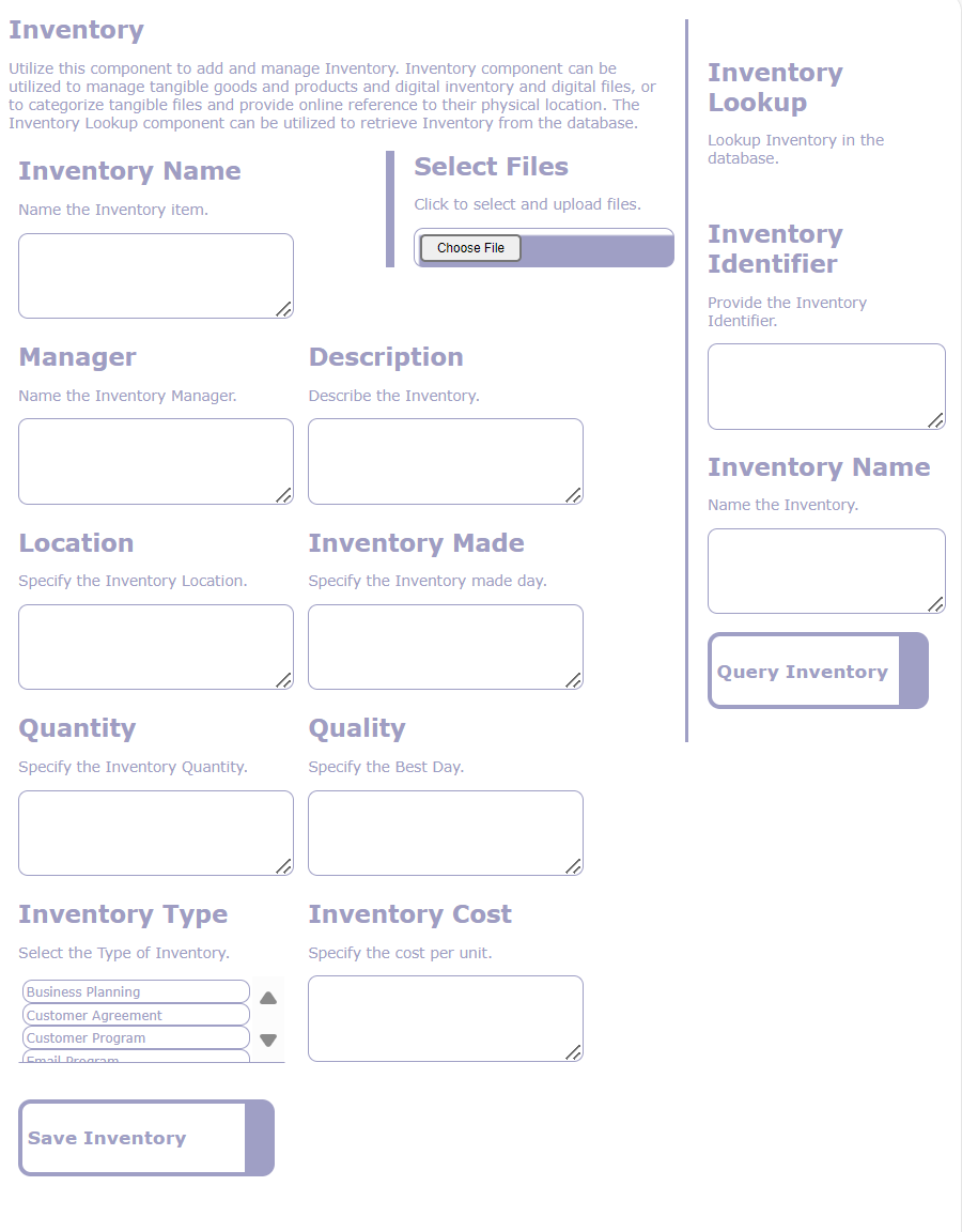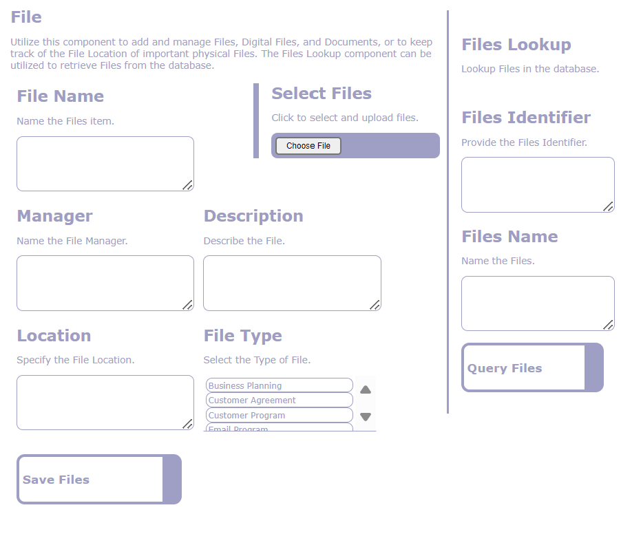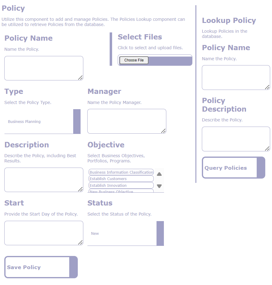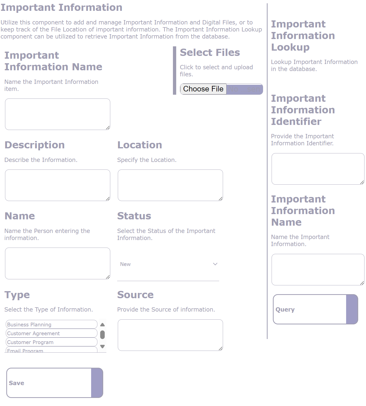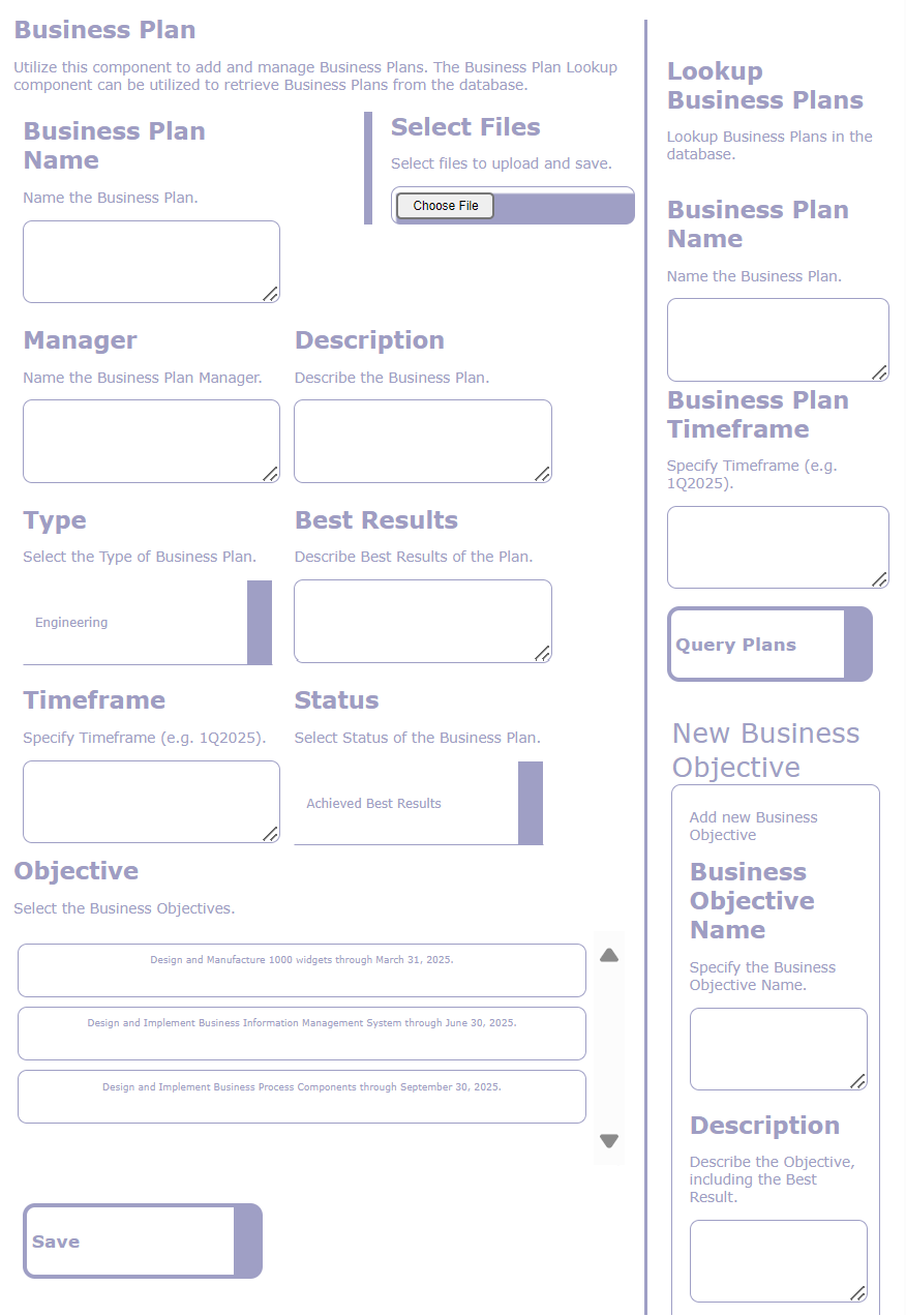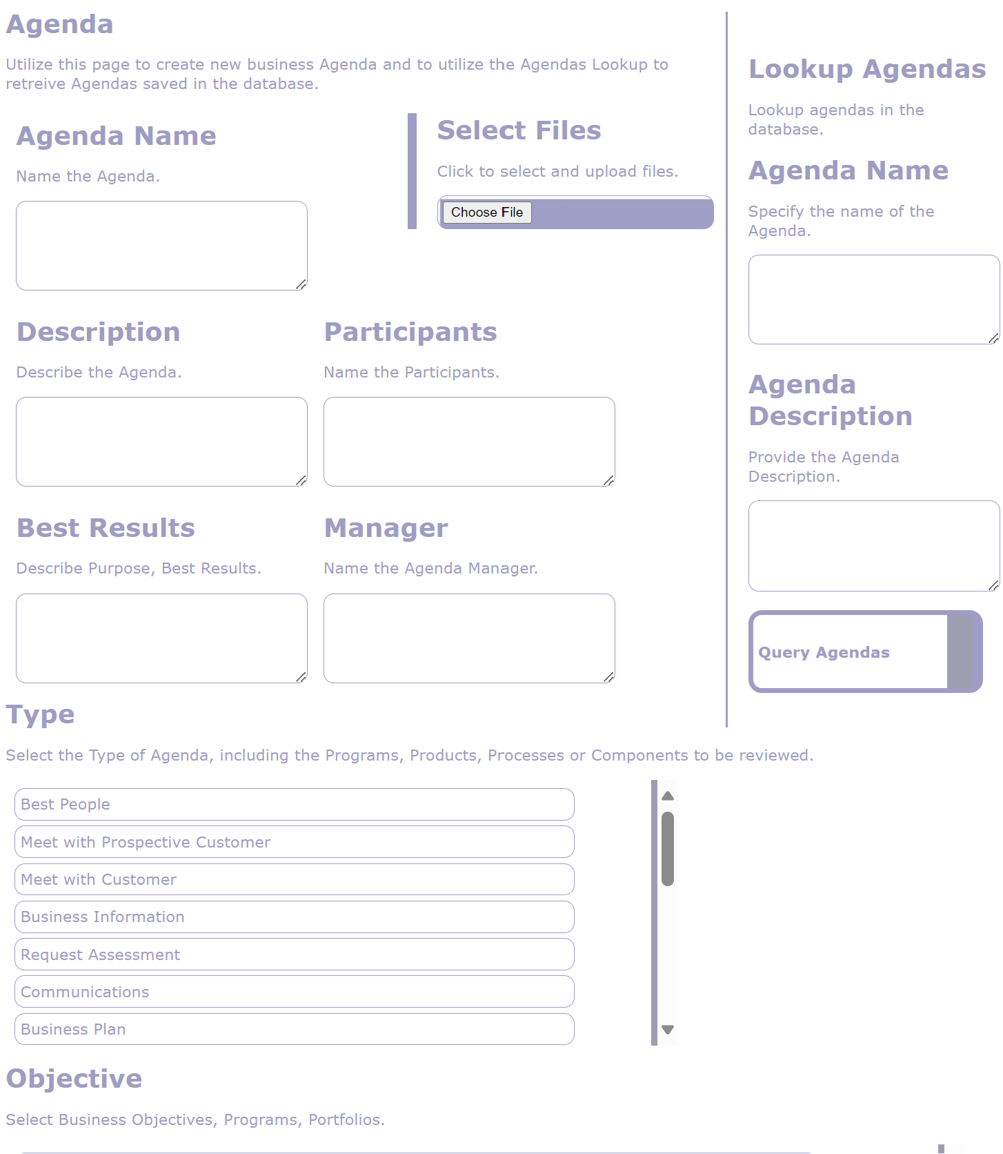 The Agenda component provides the addition, management, and retrieval of Meeting Agenda and can include the attendees, timeframe, meeting objectives. Agenda is intended to manage meeting inputs and produce best results. Click on the Agenda component and view the Agenda component. Business Objectives are the important Goals that the Company Executive and Leadership team establishes, that make up the Business Plan, and then the Departments and Employees can link their Tasks and efforts to those Business Objectives. Click on the Business Objective image and view the Business Objective component. Business Plan is the important Business Objectives and plans of Company, Departments and or Person. The Business Plan component provides option of Adding new Business Objectives with specific timeframe, and can be specific to Company Departments. Click on the Business Plan image and view the Business Plan component. The Contact component provides the addition, management, and retrieval of important People information, such as Customers, Prospective Customers, Service Providers, Goods Providers, and Friends of the Business, with option of tracking Communications with the Contact. Click on the Contact component and view the Contact component. Twizzles LLC Customers can initiate the request of Custom Components, including functionality, automations and integrations, and requires unique Customer Agreement contract with Twizzles LLC that defines the scope, schedules, responsibilities, team, fees. Click on the Custom component to order. The Customer component provides the addition, management, and retrieval of Customer information, such as Customer Profile, Correspondences, and Contracts. Click on the Customer component and view the Customer component. Definition is the important Business terms, abbreviations, and meanings that guide Employees and Customers in their work, and is intended to provide clarity and clarification of important Words utilized in Business. Click on the Definition image and view the Definition component. Employee includes the Employee Career Plan and important Employee work that aligns with the Business Objectives and plans of the Company. The Employee component provides option of Adding new Employee Business Objectives with specific timeframe, and can be viewed with Manager during Employee Management process. Click on the Employee image and view the Employee component. Fact provides repository of important Facts that may be utilized in managing Business, and include categories such as General, Customer, Employee, and includes function of adding the fact Source, and includes Process flow of reviewing and approving Facts, if required. Click on the Fact component and view the Fact component. Utilize the File component to upload, save, and manage Documents, while categorizing files with Managers and Types. The File Process Component provides file management option of Business Information. Click on the File image and view component. Financial is important Business Finance statement. The Financial Component can be utilized to add and manage Financials, upload and Save important Financials documents in various file types. Click on the Financials image and view the Financials component. Guideline is the important recommendation and rule that Employees and Customers are requested to be in compliance with. Add Guidelines to keep the final version, in addition to the specific Guideline information. Click on Guideline image and view the Component. Important Information component provides option to save important information, the location of that information, and the Source of the information, along with status. Innovation is the new and enhanced Products, methods, and processes that the Business is planning, implementing and managing. Click on the Innovation image and view the Innovation component. Inventory is the tangible, digital or electronic finished goods made, or sourced components made or purchased. Specify when Inventory is made and where the Inventory is located. This Component can be utilized to track electronic files and products. Click on the Inventory image and view the Inventory component. Measurement provides the key performance metrics that the Business, Department, or Person can utilize to manage quality Products. Click on the Measurement image and view the Measurement component. Order is request from Customer to provide Goods and or Services and the Component provides option to specify Goods, Prices, order status, customer information, and accepts credit card payments. Click on the Order image and view the Order component. Payment can be utilized to track Payments made from Customers, and can be integrated with Electronics and Online Payments provider, with Custom option. Click on the Payment image and view the Payment component. Picture provides the option of categorizing and storing Business specific images that can be stored and retrieved from the File Server and provide information of the picture, including when and where picture was taken. Click on the Picture image and view the Picture Component. Policy is the important Business Guideline and Rule that Employees and Customers are requested to be in compliance with. The Policy component provides option of adding and managing Business Policies. Click on the Policy image and view the Policy Component. Portfolio provides the grouping of Programs and Business Objectives into Departmental or Portfolio view, and includes Portfolio Manager, statuses, and timeframes. Click on the Portfolio image and view the Portfolio Component. Principle is important Business values and attributes that guide the Organization. Click on the Principle image and view the Principle component. Process includes the steps and activities that the Business requires, categorized with Statuses, Managers, Types, and like all Components, provides the option of saving Process files and documents onto the file server. Click on the Process image and view the 