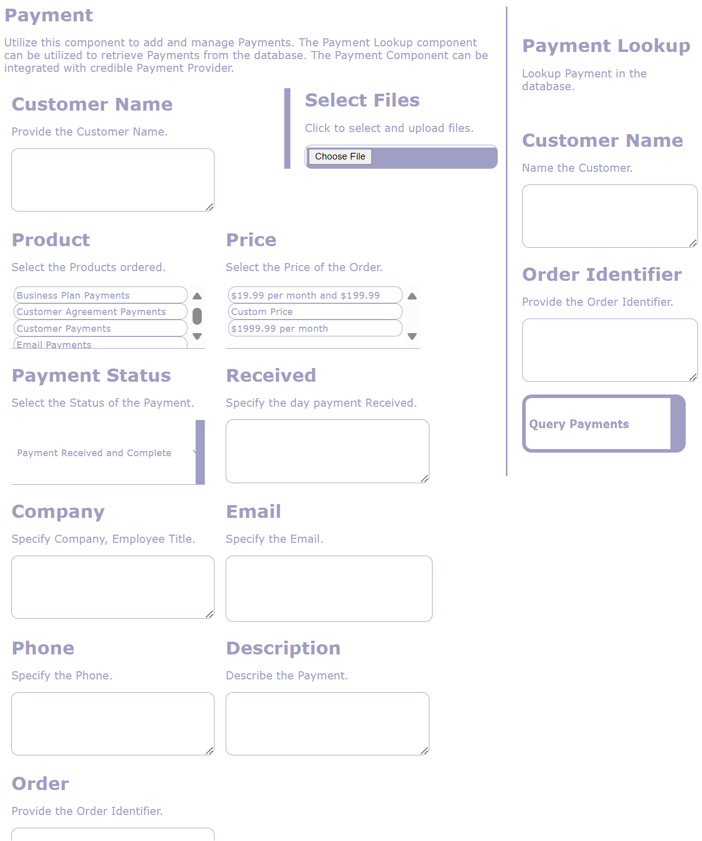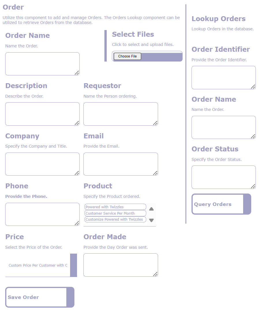 Component refers to the Power with Twizzles Business Process Components, such as the Order component, and is the important part of the Twizzles LLC Customer's Process. Component includes the information required to initiate that Business process, and includes the function of saving files, creating new process information with Types, Statuses, Managers, Descriptions, Names, and other relevant information that can be stored and retrieved from the Database. The Components can be utilized to generate new information or to organize and to store Process information from different file sources. Components can be utilized as is, or customized with integrations, such as adjusting inventory levels after Order is sent to the Customer, sending an Employee an email after an Order is placed, sending alerts and reminders when an upcoming deliverable is due, or prompting an Executive to create long term Strategic Plans. Customizations and integrations require unique Customer Agreement and can be ordered at the